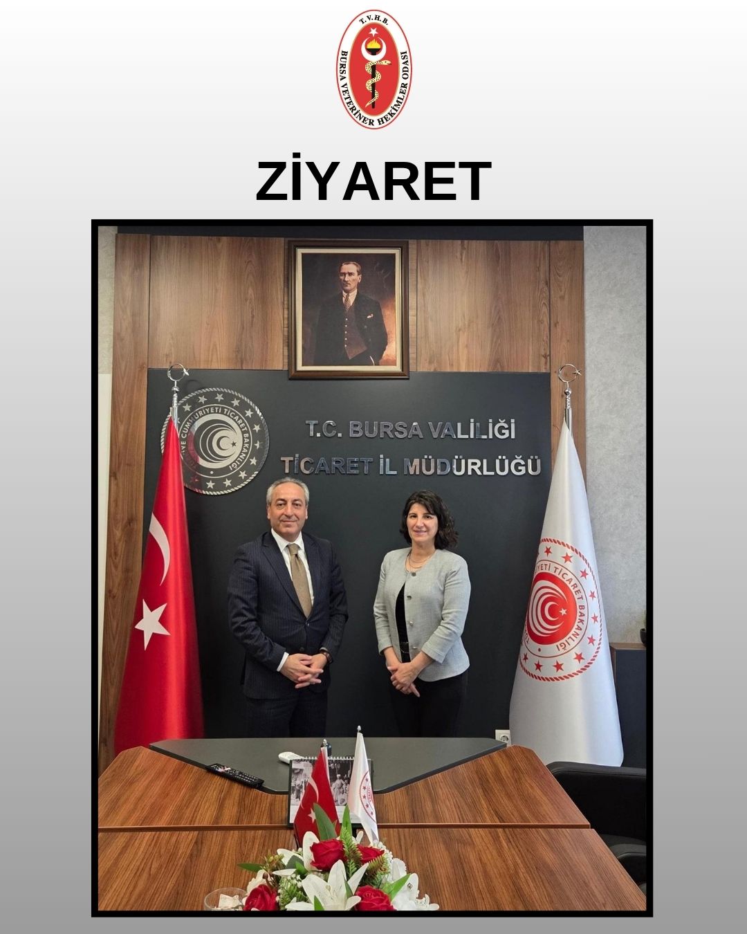 Bursa Veteriner Hekimler Odası Başkanı Veteriner Hekim Melike Baysal, Bursa Ticaret İl Müdürü Sayın İsmail Aslanlar’ı ziyaret etti.